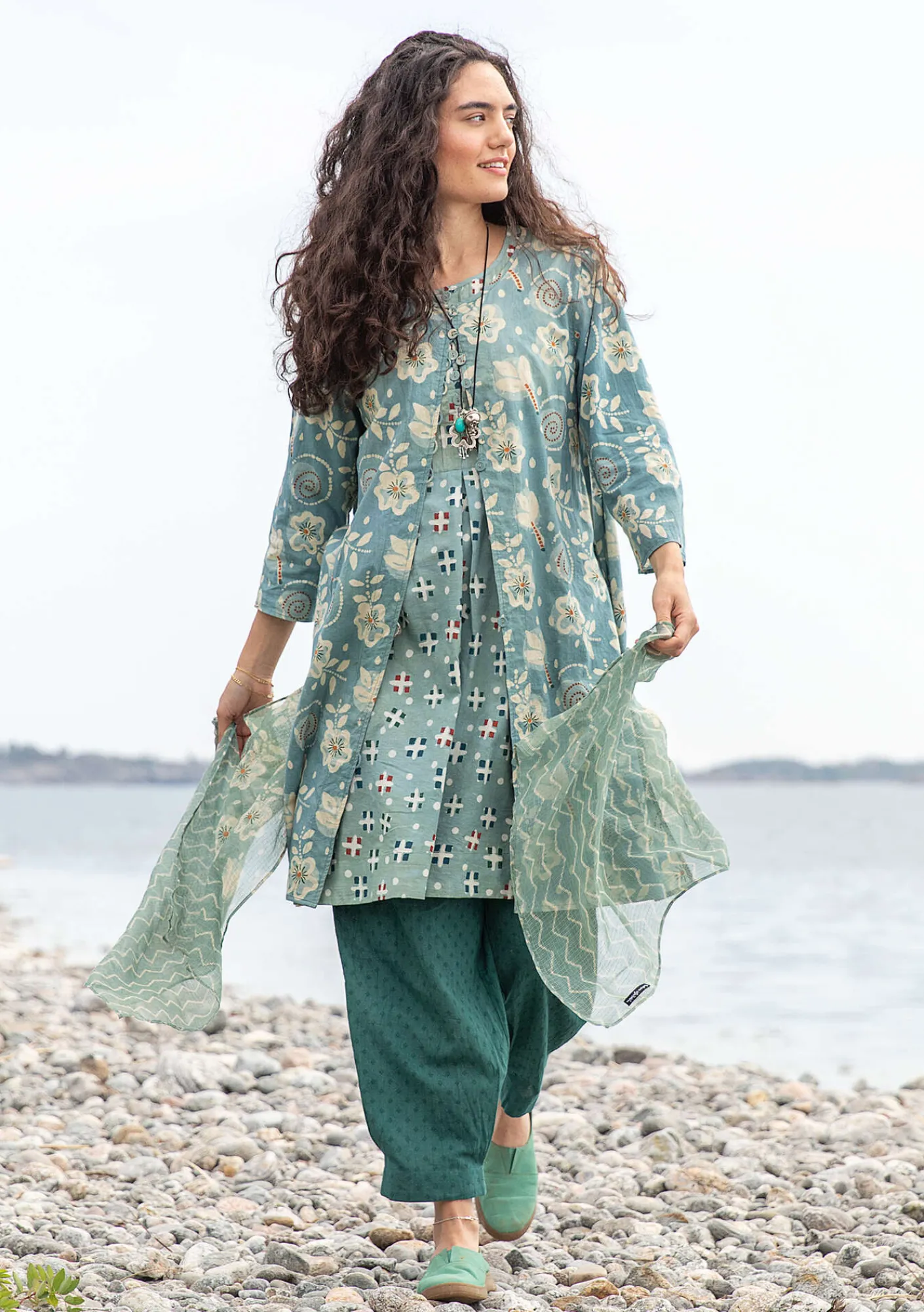 Genomknäppt klänning med mönster som är både block- och reservagetryckt samt växtfärgat. Rund halsringning, lite längre trekvartsärm samt tygklädda knappar. Dolda fickor samt slitsar i sidorna. Öppningen framtill har på insidan ett annat mönster, en fin detalj vi gillar.