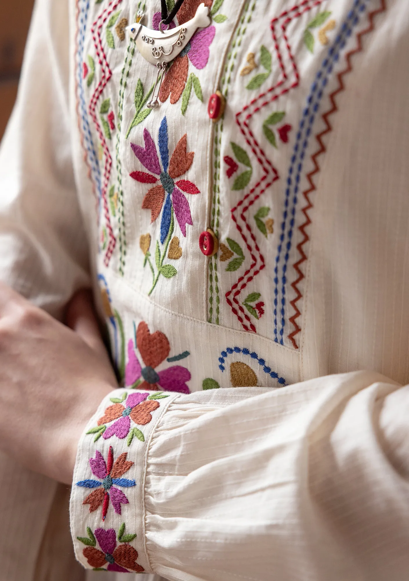 Vävd tunika med vackra broderier på både framstycke, runt manchetter och som en bård vid plaggets nederkant. Modell med hellång ärm och ett ok med rynkning framtill. Rund halsringning som är bandkantad i accentfärg. Tygklädda knappar i accentfärg vid oket och ärmsluten.